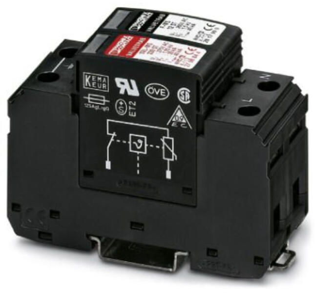 Túlfeszültség-levezető 3-vezetékes tápellátó rendszerekhez (L1, N, PE), mely alapelemből és védelmi dugaszból áll, NS 35 kalapsínre szerelhető.