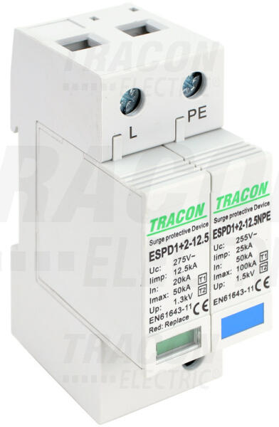 Tracon Electric Tracon ESPD1+2-12.5-1+1P T1+T2 AC típusú túlfeszültség levezető, cserélhető betéttel Uc: 275V; Iimp: 12, 5kA; In: 20/40kA; Imax: 50kA; Up: 1, 3kV; 1+1P (ESPD1+2-12.5-1+1P)