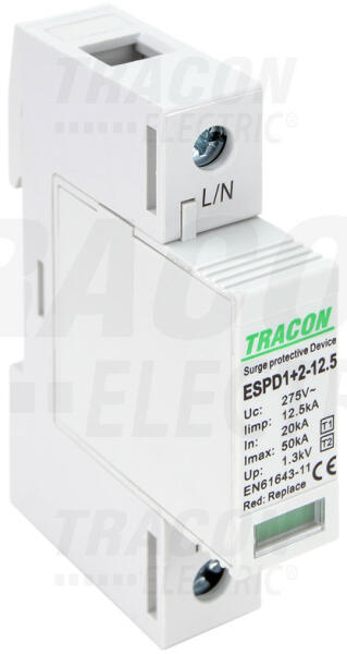 Tracon Electric Tracon ESPD1+2-12.5-1P T1+T2 AC típusú túlfeszültség levezető, cserélhető betéttel Uc: 275V; Iimp: 12, 5kA; In: 20kA; Imax: 50kA; Up: 1, 3kV; 1P (ESPD1+2-12.5-1P)