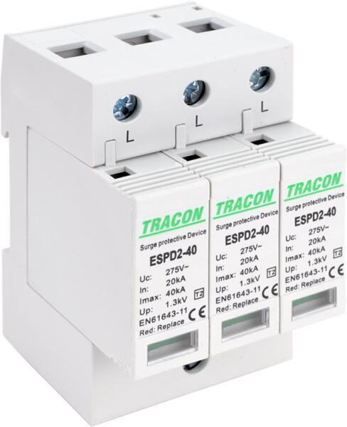 Tracon Electric Tracon ESPD2-40-3P T2 AC típusú túlfeszültség levezető, cserélhető betéttel Uc: 275V; In: 20kA; Imax: 40kA; Up: 1, 3kV; 3P (ESPD2-40-3P)