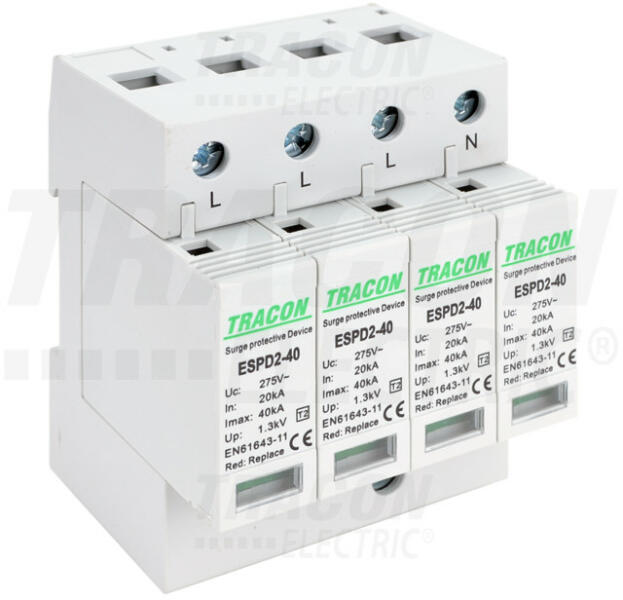 Tracon Electric Tracon ESPD2-40-4P, T2 AC típusú túlfeszültség levezető, cserélhető betéttel Uc: 275V; In: 20kA; Imax: 40kA; Up: 1, 3kV; 4P (ESPD2-40-4P)