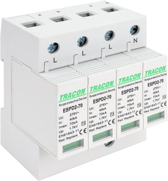 Tracon Electric Tracon ESPD2-70-4P T2 AC típusú túlfeszültség levezető, cserélhető betéttel Uc: 275V; In: 40kA; Imax: 70kA; Up: 1, 7kV; 4P (ESPD2-70-4P)
