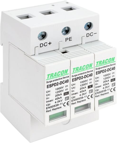 Tracon Electric Tracon ESPD2-DC40-1000 T2 DC típusú túlfeszültség levezető, cserélhető betéttel Ucpv: 1200V; In: 20kA; Imax: 40kA; Up: 4kV (ESPD2-DC40-1000) - hejovill