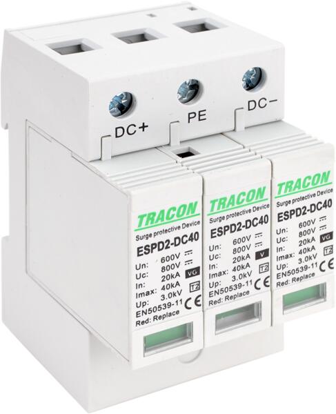 Tracon Electric Tracon ESPD2-DC40-600 T2 DC típusú túlfeszültség levezető, cserélhető betéttel Ucpv: 800V; In: 20kA; Imax: 40kA; Up: 2, 6kV (ESPD2-DC40-600)