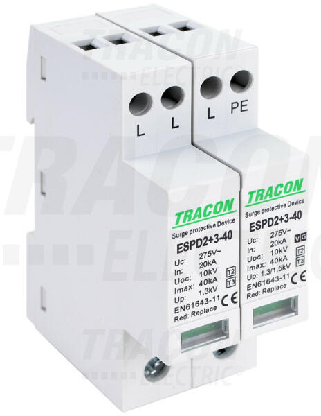 Tracon ESPD2+3-40-3+1P T2+T3 AC típusú túlfeszültség levezető, egybeépített Uc: 275V; In: 20kA; Imax40kA; Uoc: 10kV; Up: 1, 3/1, 5kV; 3+1P (ESPD2+3-40-3+1P)