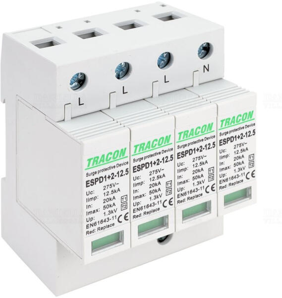 Tracon AC típusú T1+T2 túlfeszültség levezető, cserélhető betéttel ESPD1+2-12.5-4P (D1+2-12.5-4P)