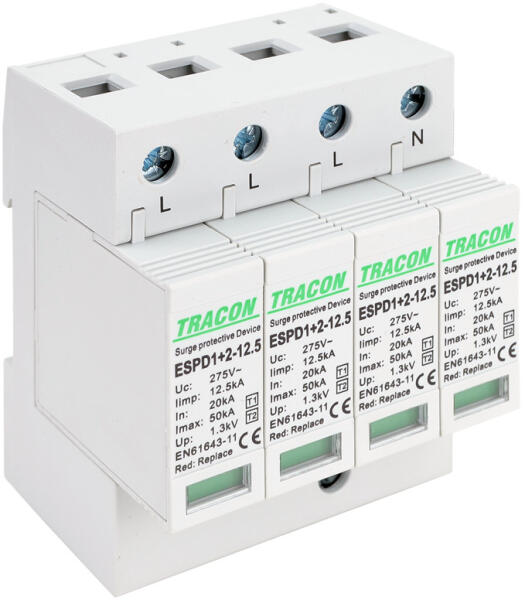 Tracon T1+T2 AC típusú túlfeszültséglevezető, cserélhető betéttel 4P 12, 5kA 275V (ESPD1-2-12-5-4P)
