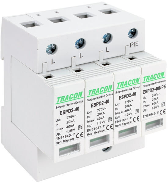 Tracon T2 AC típusú túlfeszültség levezető, cserélhető betéttel 3+1P 40kA 275V (ESPD2-40-3-1P)
