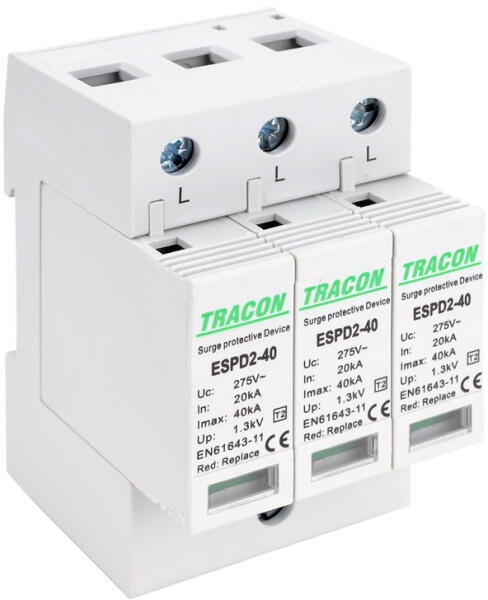 Tracon T2 AC típusú túlfeszültség levezető, cserélhető betéttel 3P 40kA 275V (ESPD2-40-3P)