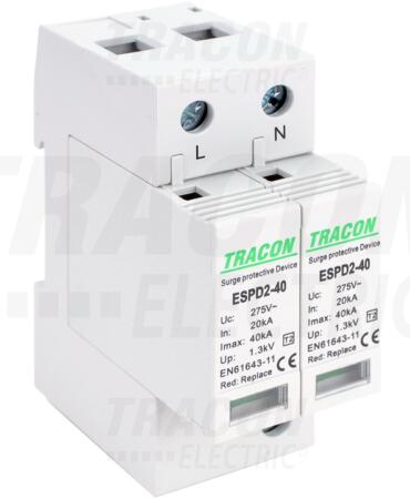 Tracon T2 AC típusú túlfeszültség levezető, cserélhető betéttel Uc: 275V; In_20kA; Imax_40kA; Up_1, 3kV; 2P (ESPD2-40-2P)