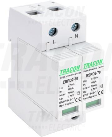 Tracon T2 AC típusú túlfeszültség levezető, cserélhető betéttel Uc: 275V; In_40kA; Imax_70kA; Up_1, 7kV; 2P (ESPD2-70-2P)
