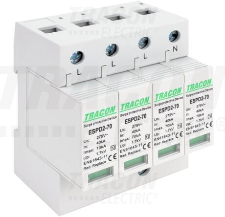 Tracon T2 AC típusú túlfeszültség levezető, cserélhető betéttel Uc: 275V; In_40kA; Imax_70kA; Up_1, 7kV; 4P (ESPD2-70-4P)