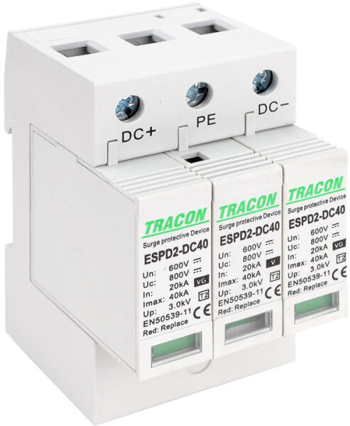 Tracon T2 DC típusú túlfeszültség levezető, cserélhető betéttel 800V (ESPD2-DC40-600)
