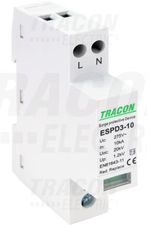 Tracon T3 AC típusú túlfeszültség levezető, egybeépített Uc: 275V; In_10kA; Uoc_20kV; Up_1, 2kV; 2P (ESPD3-10-2P)